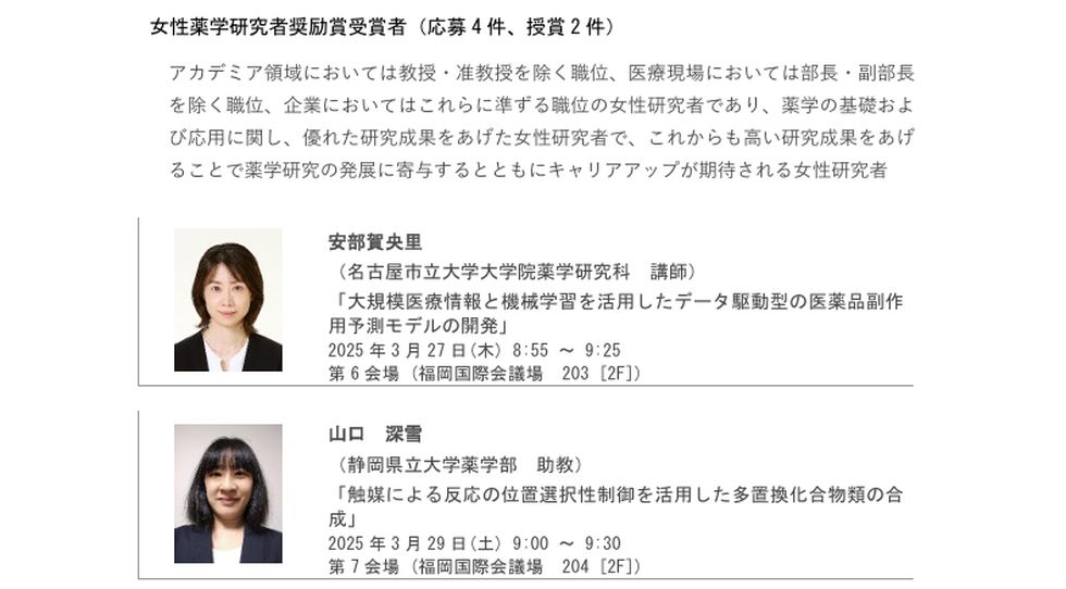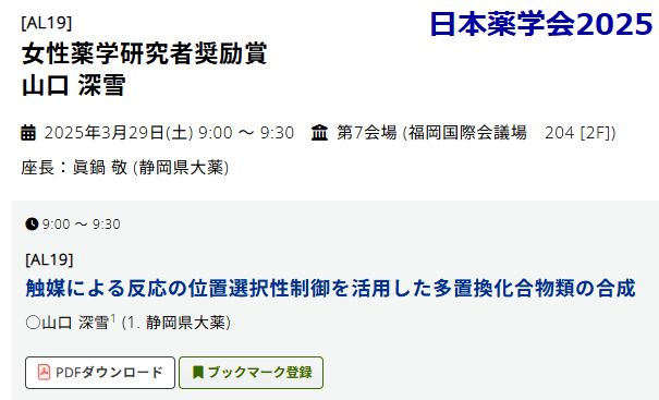 長女の講演予定「受賞者講演」なぜか講演にも座長がいる、研究室の教授がそのために学会参加?もう一人の奨励賞受賞者は名古屋市大の方、受賞時点では 講師だったが現在は准教授になっている。 |