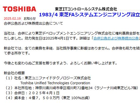 消えゆく:東芝ITコントロールシステム(元:TOSFEC)1983年に創業した当時:東芝FAシステムエンジニアリングが統合で解散するとのお知らせあり、初代の白杉社長が全国を回って人材を集めて 作り上げた会社、20世紀末には何年か非常勤取締役をしていた(当時は菅谷社長)。関係会社の整理・統合の一環なのだろうけど寂しいものもあり。 |