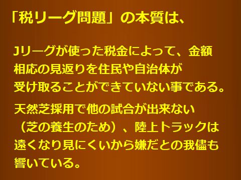 サッカーの「税リーグ」問題は深刻!J1からJ3までやたら数が増えたJリーグのチーム、観客を集められない地方チームは赤字。 Jリーグの規定するスタジアム規則に沿わない古いスタジアムの改修・建替えも金がなく税金頼み、 更に「天然芝」の規定でサッカー以外で使える日数がゼロ、陸上トラックは嫌との主張も「身勝手」と捉えられている。 地方自治体も財政が厳しくJリーグ基準の建て替えなど到底不可能、自前で整備せよという声も出ている。 |