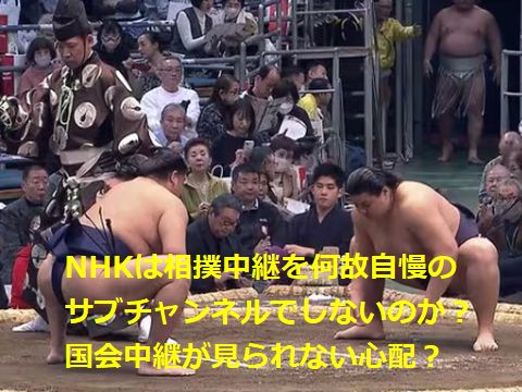 国会中継+高校野球時に相撲は冷遇せっかくNHKご自慢のサブチャンネル放送があるのに使わないのは何故か?勘ぐって考えると国会中継より相撲中継のほうが圧倒的に視聴率が 高いという事態を恐れているから?(国会からのクレームが怖い) |