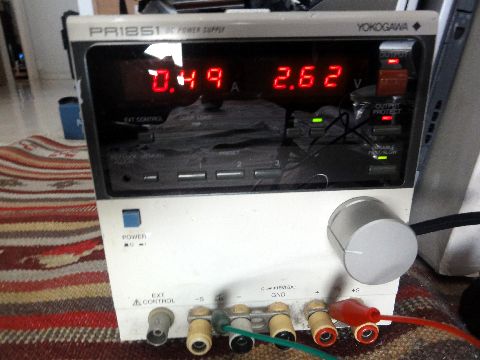 実験用安定化電源のチェック中古で傷が多い(以前制御回路用の5Vレギュレータ故障を修理)が動作は大丈夫そう、ただ出力スイッチの動作が渋いので いずれ修理する必要あり(スイッチ交換?あるいは関連回路修理か)。 |