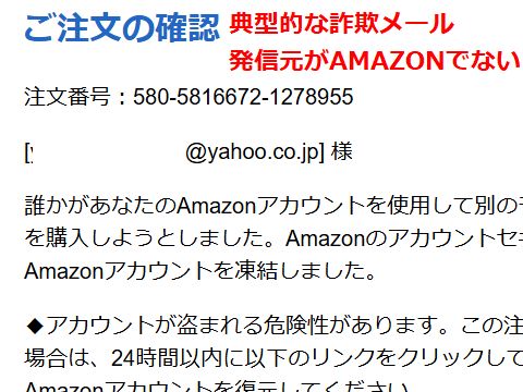 こんな詐欺メールが来る最近のウィルス対策は改善され自動的に「怪しいメール」に区分されるので引っ掛からない。発信元がAMAZONと表示されるが詳細を みればとんでもないアドレス(ロシアなど)なので直ぐにわかるのだが。「キャンセルで返金するのでカード情報を入力せよ」という フィッシング詐欺の典型。 |