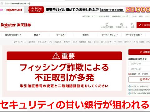 楽天証券はセキュリティが甘いと読まれた?フィッシング詐欺が多発する楽天証券、本人確認の2段階検証などが大甘だったのが原因のよう、今更強化しても被害は戻らない。 楽天証券に損害賠償責任が生ずるのかは解らないが。 |