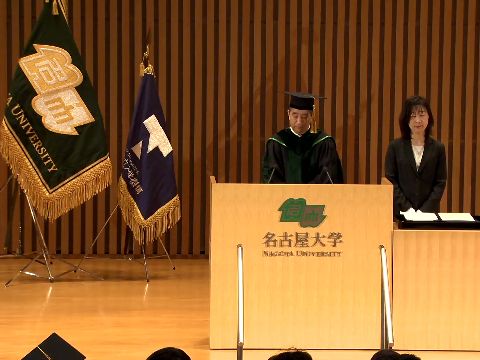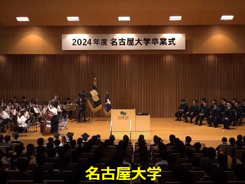 わが母校:名古屋大学生数に比して講堂が狭いので3回に分けて実施、学部前半+大学院+学部後半、そのため交響楽団や混声合唱団などすべて3回 同じことをすることになる。壇上には総長+学部長+来賓のみ参列。 |