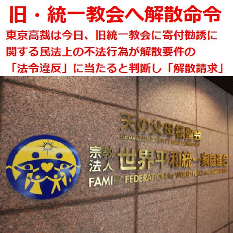 旧・統一教会に「解散命令」アベの銃殺事件をキッカケに進んだ「旧。統一教会」の違法献金集めの断罪の結果の一つがこれ。 一方で旧・統一教会とその関連団体と癒着し選挙に利用してきた歴代の自民党政権はまだ完全に関係が切れたとは言い難い状況も あってさらに警戒が必要。 |