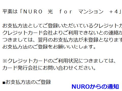クレジットカードが無効?NUROから妙なメール、指定のカードが使えない?という内容。詐欺メールかとも思ったが確認すると要するに「デビットカード」は登録不可 という事らしい。希望してもいないのにセゾンNEXTカードが勝手にデビッドカードになったのが原因と判明、早速登録カードを変更した。 最近このカードの使用明細が突然紙で来たので不審に思っていたところだった。 |