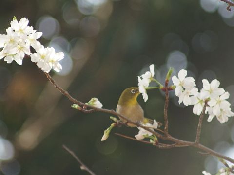メジロが三羽、蜜を吸いに来ているまだ花が少ない時期なので桜の蜜を吸いに朝早くからきている。 |