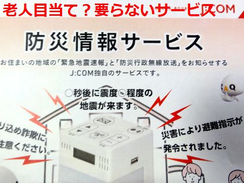 胡散臭いJCOMの勧誘スマホやテレビで十分な機能を端末設置(初年度だけ無料、以降は月330円)を奨める戸別訪問の通知、なぜか 管理組合と契約しているからと強調するが何も意味なし、電波強度調査と称して戸別訪問し有料放送の勧誘をする押しかけ 商法には呆れるしかない。何故か同時にTV台数やパソコン台数など個人情報を集めようとするインチキさ、勿論お断り。 |