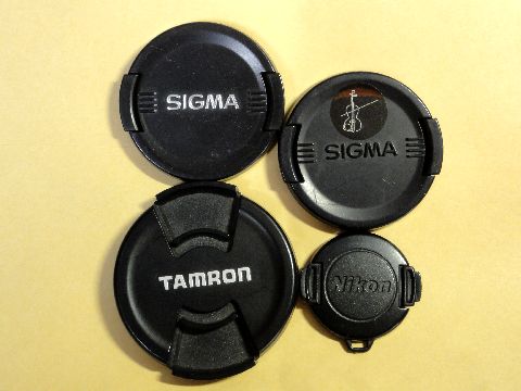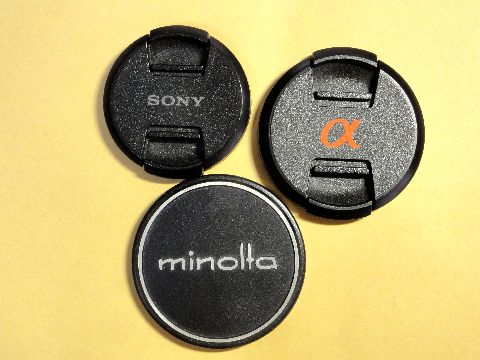 レンズキャップ、いろいろ昔のような被せ式はなくなり(ここでは古いミノルタがそう)殆どがプラスチック製のばね式ツメによる固定 (ニコンは昔からだが)。SONYはミラーレス初期はNEX銘だったが、その後SONY銘の表記へと変わった。 |