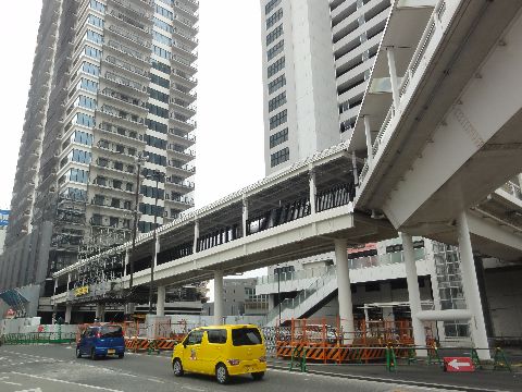 駅前の新ワマンへのデッキ通路は完成間近既存と同じようなデザインだが何故か通路脇の仕切りの造りが違う、従来は模様付ガラスの構造だったが、今回は 民家の塀のような縦棒というシンプルな構造、基本の構造体は替えられないので出来る範囲で費用削減を図ったのだろう。 |