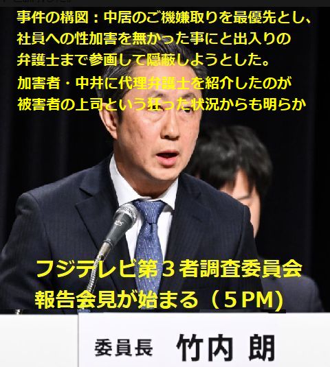 フジテレビ性加害問題の調査報告始まる午後5時からフジテレビで調査委員会による報告会見が始まった、報告書がかなり詳細に記述されているので質問は細部に 関するものになる? |
