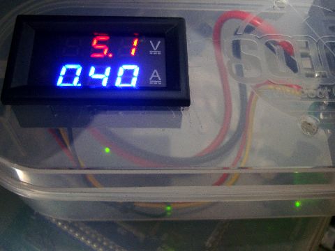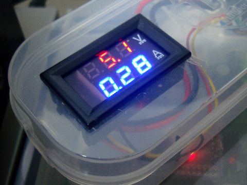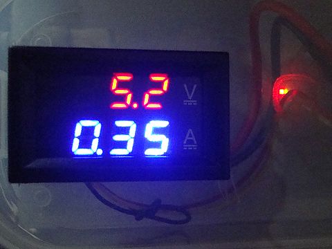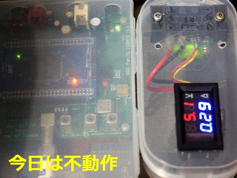 FPGA FMチューナ用電源現在、FPGAチューナに使っている電源、不調になる前は5Vの小型ACアダプタ使用だったが、電流値の 測定を目的に変更。中華製の電圧・電流表示器(確か300円以下、恐るべし)でモニタするようにした。 |
