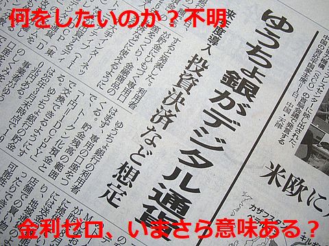 ゆうちょ銀行が迷走?いまさらのデジタル通貨導入の報、デジタル化進展で今更感が強い、さらに無利子(費用が掛かるので当然か)。 誰に使ってもらいたいのか?良く解らん、利権の塊IIJへの忖度? |