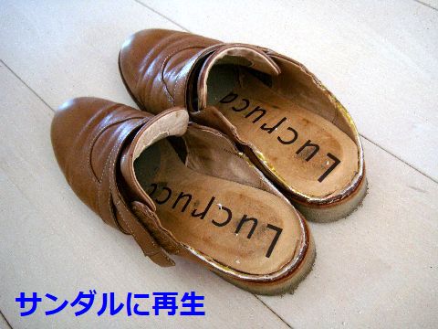 靴をサンダルへ加工もう履かない靴をベランダ用のサンダルに加工してとの要望で、踵部分を金切り鋏で切断、切断部がばらけない様に接着剤で とめて完成。 |
