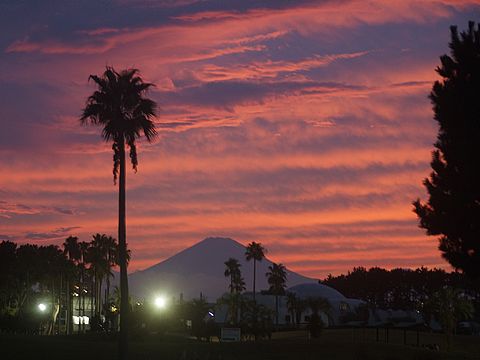 真っ赤な夕焼けの富士山明日以降は天気が悪くなるので真っ赤な夕焼けになった。北の空は雷の光も見える。 |