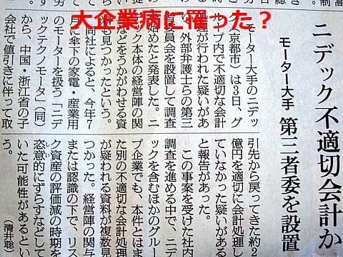 ニデックも普通の会社になった?不正経理が発覚長い間居座っていた創業者の目が届く範囲を大きく超える規模になり、不正経理もあるという普通の会社に なったのかと。 |