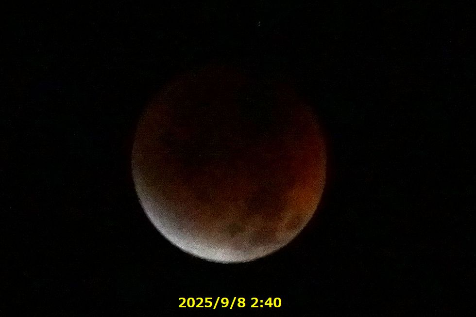 皆既月食午前2時半過ぎに皆既月食、月は非常に暗くなり赤味掛かった色に。使用カメラ:SONY α77+SAL75300(450mm相当) |
