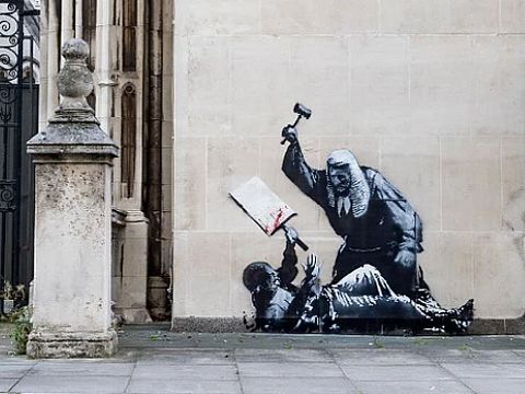 バンクシーの新作@英国英国の裁判所に書かれたバンクシーの絵、都合が悪い様でさっそく隠して撤去するという。 |
