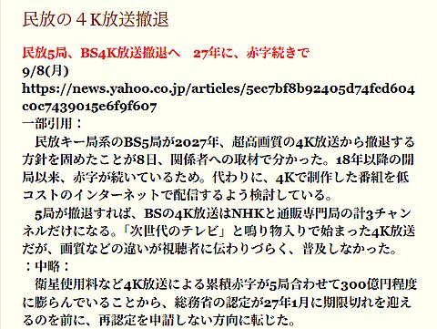 民法4K放送撤退、当然の結果!4Kの特徴が生きたコンテンツもなく、既存コンテンツの4K拡大版ばかりで何の効果も期待できず、 さらに衛星放送の使用料も嵩んで大赤字、撤退は当然の帰結。8K放送なんて夢のまた夢? |