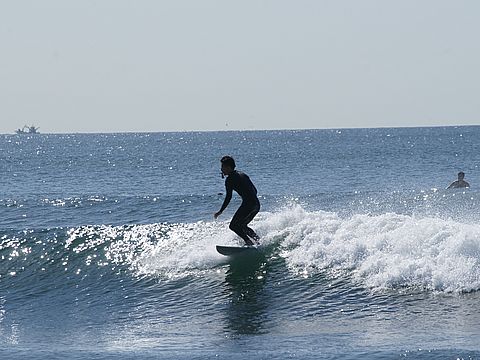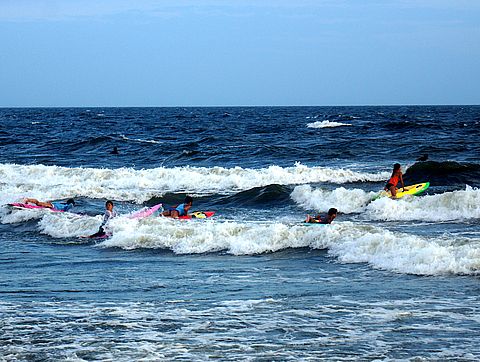 苦戦している子もいたりまだ初心者では大きな波が来ると押し返されて前へ進めない、先輩たちはどんどん沖へ進んでいるが。 |