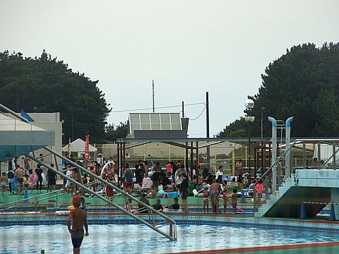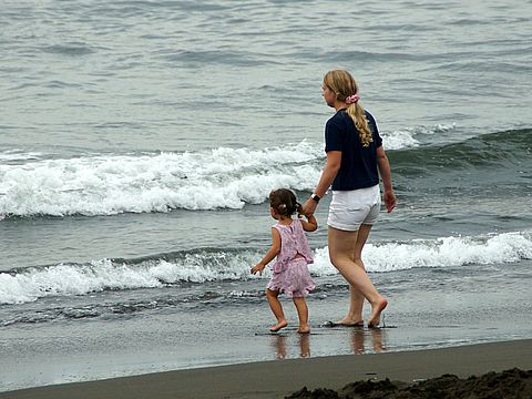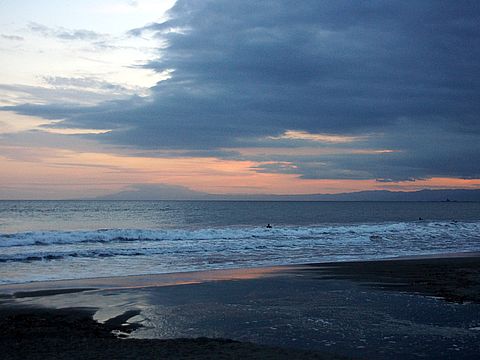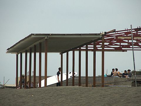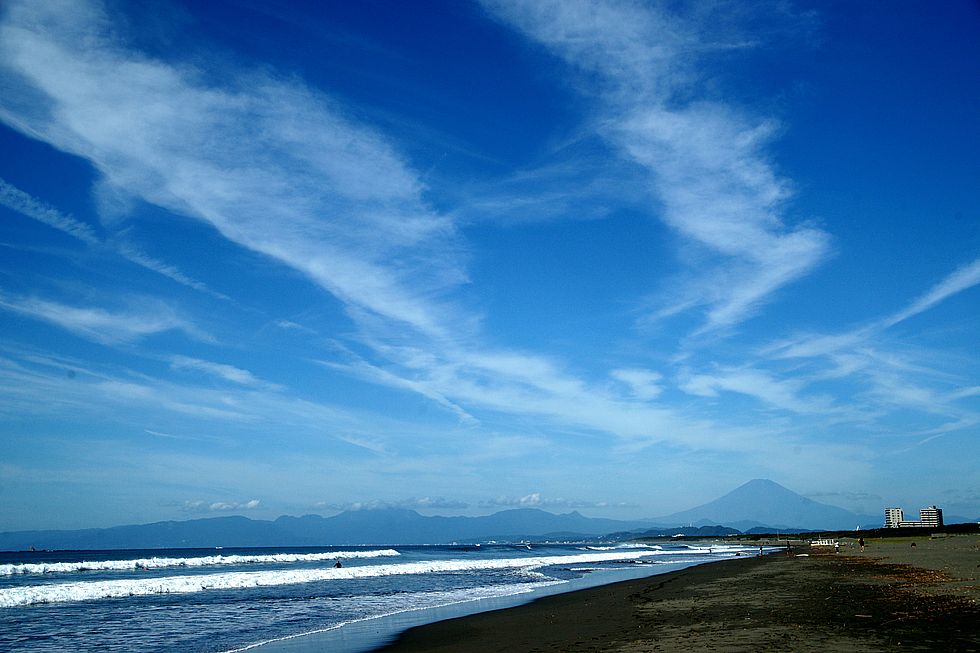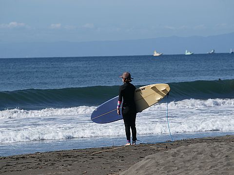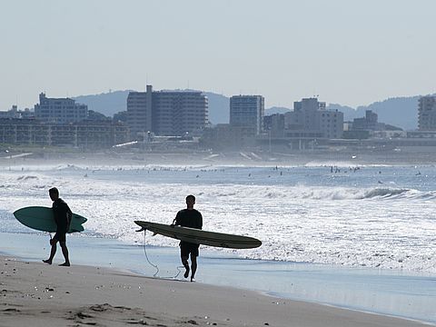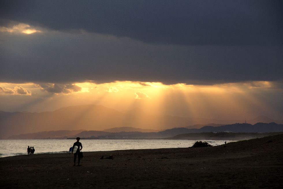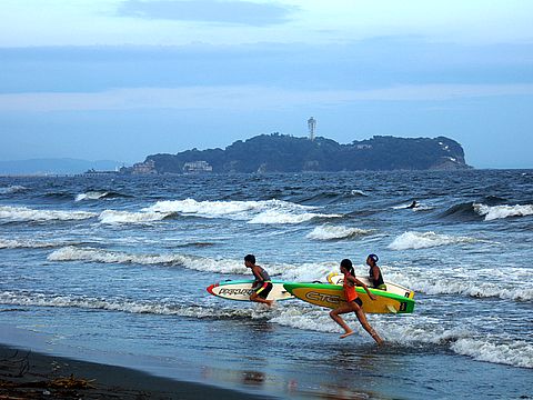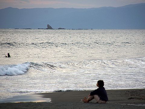 富士山は見えないが波がけっこうあってサーフィン日和、夕刻 子供連れの外国人のお父さん二人が小さな子供を連れ波打ち際へ。 |