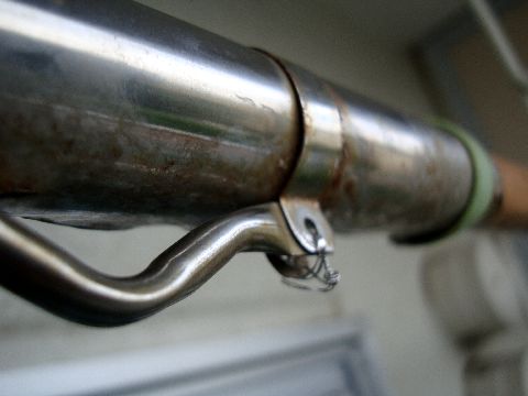 物干し竿の金具外れを修理留めていたピンが腐食して外れたのが原因、ネジ止しようとしたが長めのネジが見つからないのでステンレスの 針金で固定して修理完了。 |
