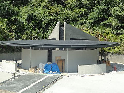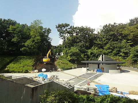 合祀墓の工事がほぼ終わりか予算不足(というか工事費高騰)で立体墓地の増設工事は中止となって合祀墓のみとなったが、本体工事はほぼ完成。 アプローチのための切削部を復元する工事をやっている。 |
