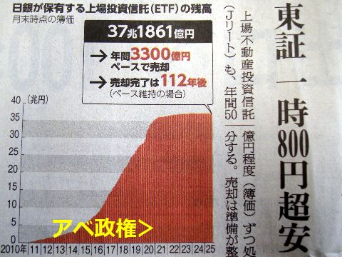 37兆円のETF債、売却へ110年所要主にアベ政権下で拡大してきたETF債、やっと売却すると日銀が判断、でも110年掛かるって冗談で しかない。 |