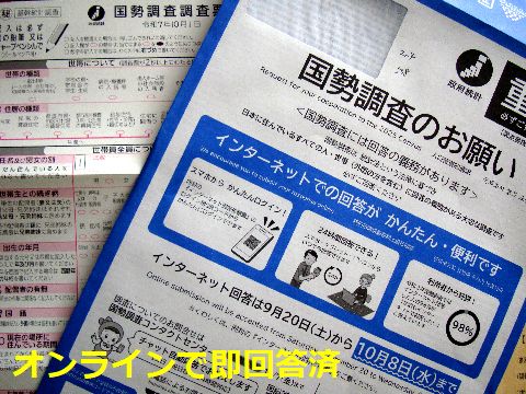 国勢調査、調査員が配布にきた今の時代に調査員が戸別に配布とは何たる旧態然(人件費が相当かかる)、さっそくオンラインで回答し完了。 |
