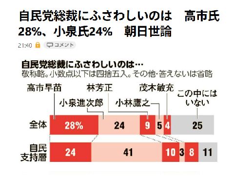 自民党・総裁選がスタート公的な選挙ではないので何でもやりたい放題の選挙らしい、自民支持層で高市がトップというのは意外な結果! 小泉はコメ対策も中途半端で成果は怪しいところ。 |