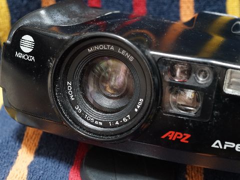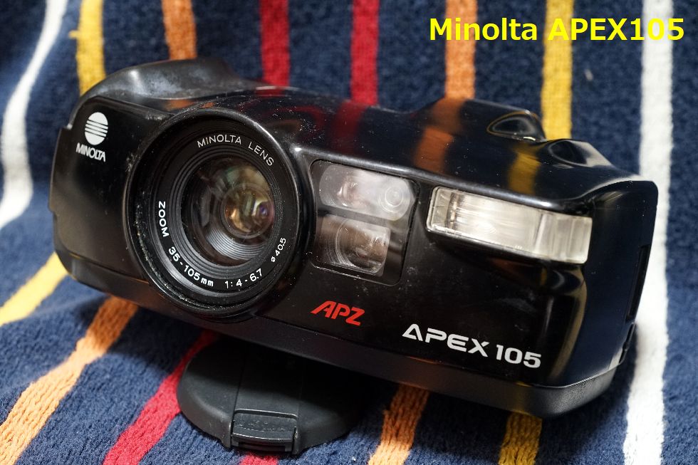 MINOLTA APEX105 デジカメみたいな自動カメラ興味本位でヤフオクで入手、何しろシャッターも絞りも設定できないしズームも勝手に動く自動カメラ。 やりすぎ自動で顰蹙を買った面もあるらしい。これでも普通の135フィルムを使う。 |