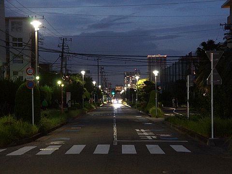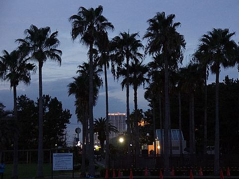 もう6時で公園も真っ暗に西の空は暑い雲で余計に暗い、奥に見える屋上が光っているのが駅前の新しい高層マンション。 |