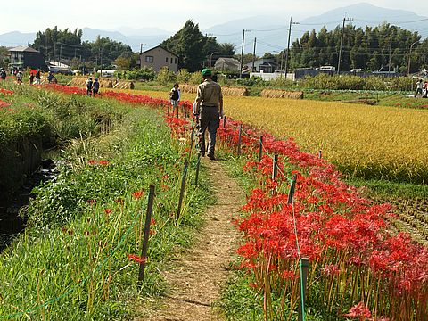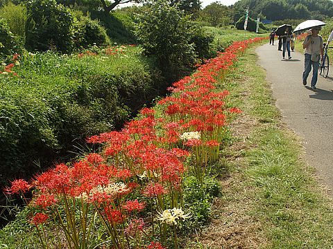 小出川・彼岸花まつりへ一週間前は殆ど咲いてなかったのに今日はほぼ満開という状態、午後から出掛けたが晴れてきて 暑くなった。これまでより出店も増えて賑やか、スタンプラリーはもう終わっていたよう。 |