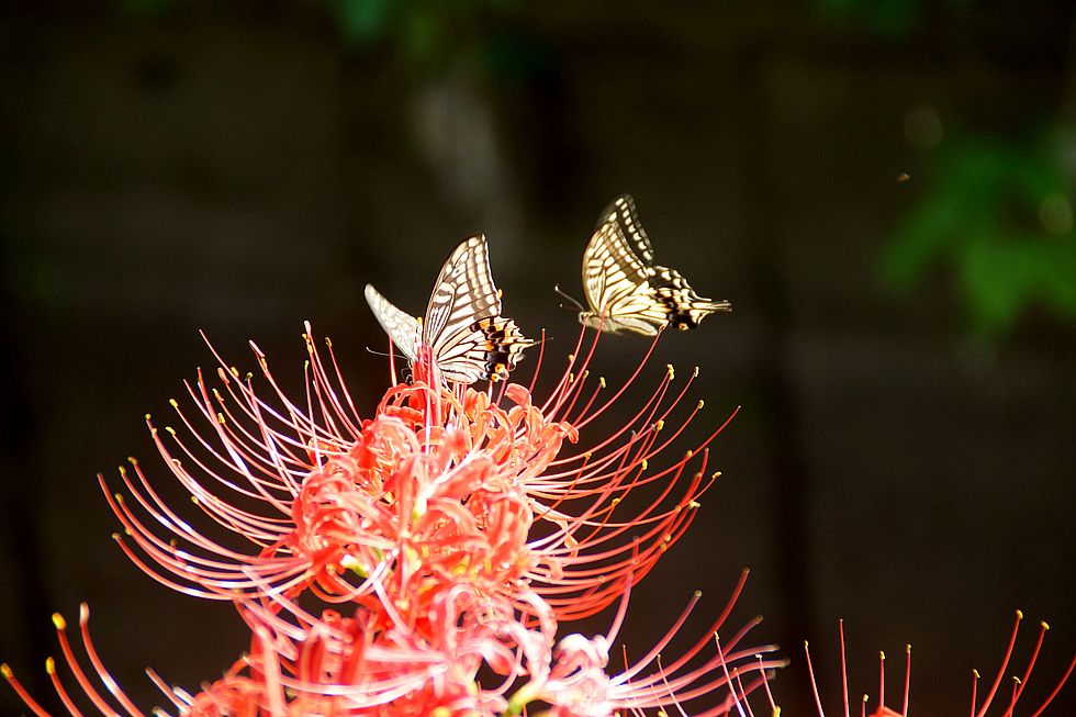 彼岸花に蝶々@小出川彼岸花まつり午後からは晴れるとの予報で昼食後に出掛けた、辻堂駅から30分370円と遠い。午前中が人出が多かった ようで空いていて狭い通路部分も混雑なし。 |