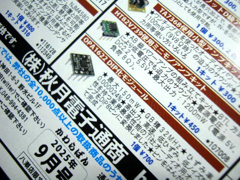 FPGA FM TUNER改造前の姿を記録に11年にわたり活躍した第2世代のFPGA FM TUNERを記録に残すべく撮影した。秋月電子通商から届いた荷物に は納品書とともに超細かな字の広告というか商品リストが入っていた。この極小字の広告はトランジスタ技術 の時代からのもの、経営者の少ないスペースに最大の情報をという信念が現れている。 |