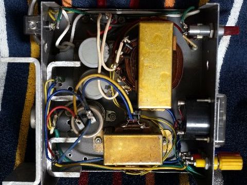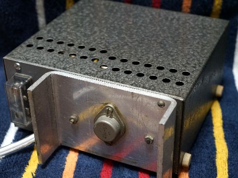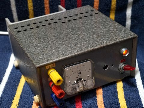 1969年に制作、1976年TK80用に改造最初のものはセレン整流器、可変電圧出力のよう、TK80用に5V-2Aと12V出力を持った固定電圧に 改造して使っていた。電圧計には切換えSW付き。電源ランプはネオン管、ネジは旧JISネジが多い。 しかしまあ良く詰め込んだもの、セレン整流器がシリコン整流器にかわりスペース大幅減、メインの トランジスタを背面に出したので何とか入っている(メインの電解コンは2個使いでスペース有効活用)、 |