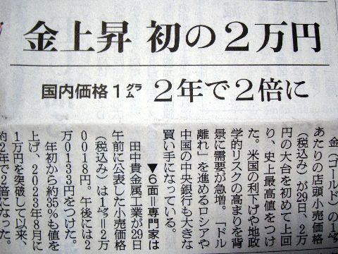 世情不安で金は値上がり続き50年前はグラムあたり2000円だった金がついに2万円越えに。 |