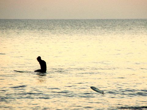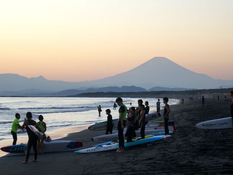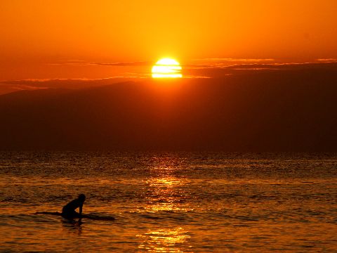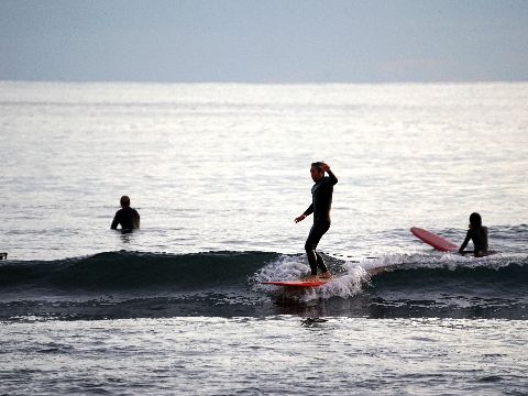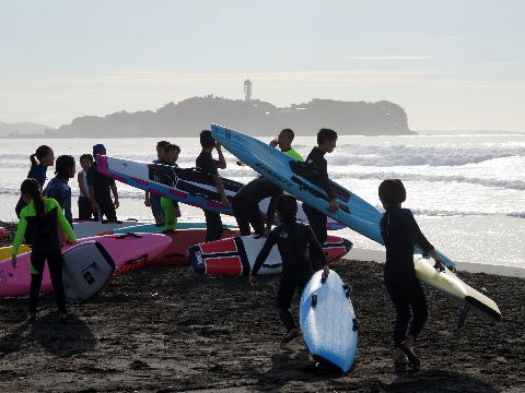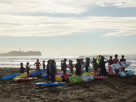 ちびっこ・サーフィン教室日没時間が早くなっているが午後5時までしっかりやっていた、結構沖まで行って波に乗って戻る練習。 |