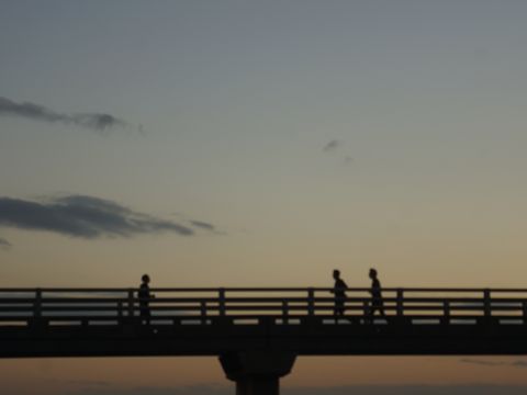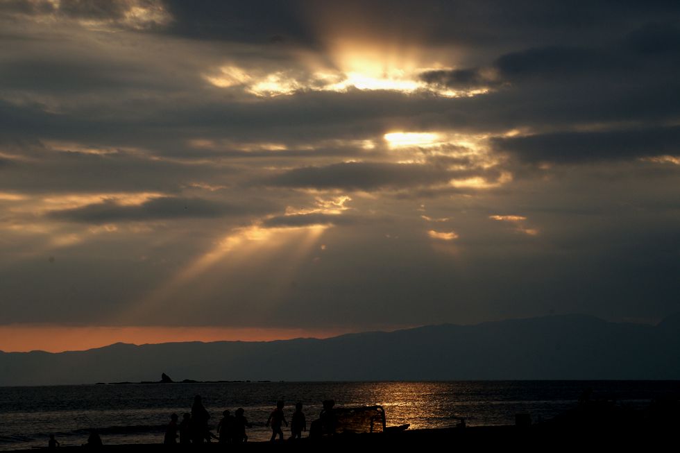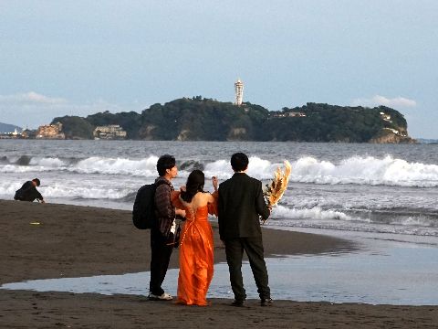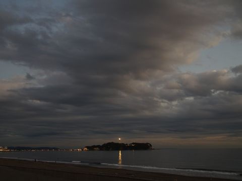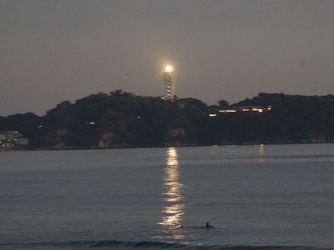 日没後、まだサーファーがいる明るい空から光がさして海が光っている。江の島の「湘南の宝石」が今日から始まった。 シーキャンドルの周りのロープについた光がきれいに見える。 |