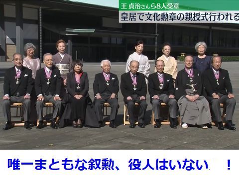 唯一まともな叙勲「文化勲章」他の叙勲は議員・役人・大学教授などの経験者が一定の基準を満たせば貰えれる勲章、民間の功労者は 低いレベルでごく少数に限られる。さすがに文化勲章にはそんな経歴で貰える勲章受章者のような表面的 な叙勲はない。 |