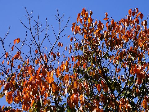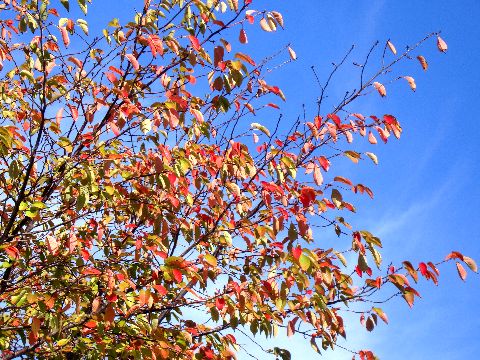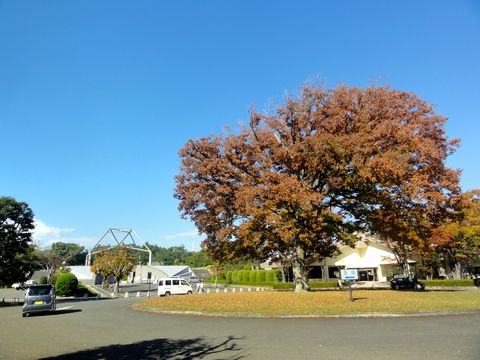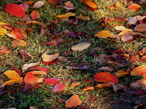 急に晩秋の風情になってきた大庭大霊園の通路では落ち葉がひらひらと落ちてくる晩秋の雰囲気に。でも駅前のイチョウの葉は まだ緑色一色で差が大きい。 |
