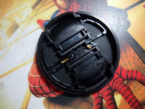 壊れたレンズキャップ、応急修理SONYのキャップ、内側のプラスチックで出来たバネ部分が折れることが多く、バネ効果が無くなり キャップが勝手に外れて落ちることになる。まずは片方折れたバネは支えを入れ、もう一カ所は欠損 部を補充、共に材料は爪楊枝。 |