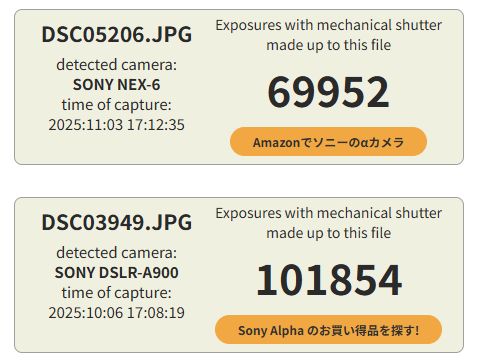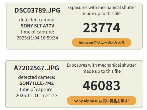 デジカメ・シャッター回数のチェック便利なサイトがあるのでやってみた、一部日対象の機種もある。α900は10万ショット越え、α7M2は 46000越え、NEX−6は70000近い、最近入手のα77は23000越え、3000枚以上撮ったので 入手時点では20000ショットか。 |