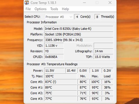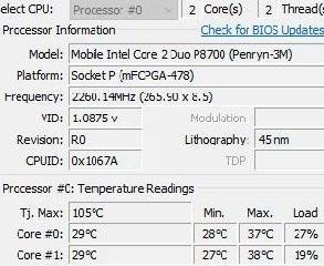 温度は十分に低いので問題なしノートPCでは全般にデスクトップ機に比べて温度が高め、負荷が掛かるとすぐに温度が上がってしまう。 それでもこのレベルなら心配なし。 |