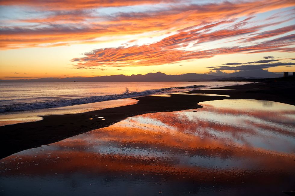 朝早めの海岸・公園早朝は赤い光でコントラストが悪いが、朝はきれいな姿が見られるので海岸へ。 |