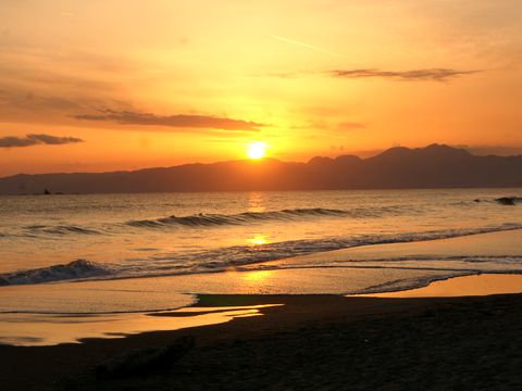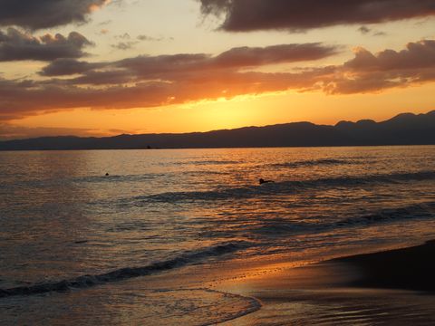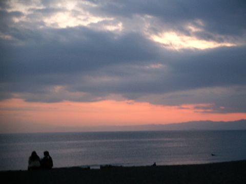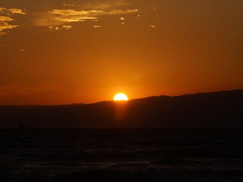 夕焼けしたが空の一部空が明るいので海は明るい、空全体がやけることはなかった。 |