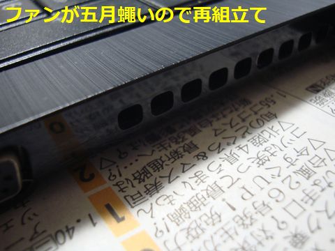 ファン回りを再組立てで静音化グリース塗布後の再組立てでファンの音がうるさい(シーッという音が目立つ)ので再度分解してファン回りを 確認してネジも締め直し、ファンはネジ1本で固定、カバー共締めでもう一カ所を固定する構造。少しでも浮くと 余計な音がするよう。 |