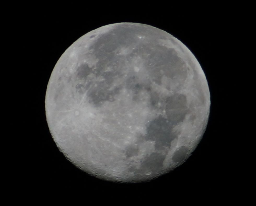 満月に近い月空気が澄んでいるので綺麗な月が望める。撮影カメラ:α77+SONY SAL70300G。 |