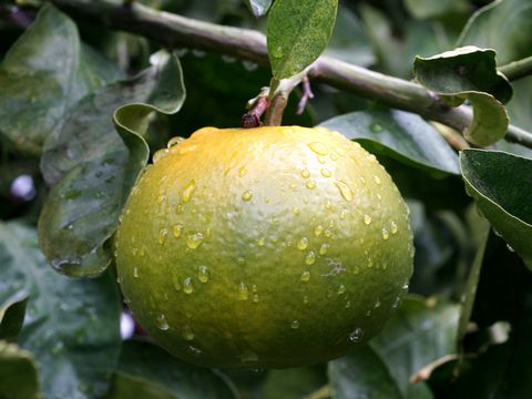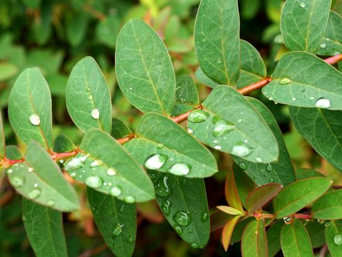 瑞々しい果物・葉っぱ昼前の雨が上がった時間帯にお弁当を買いに出たさいに撮影、雨の水滴がついて「みずみずしい」姿。 |