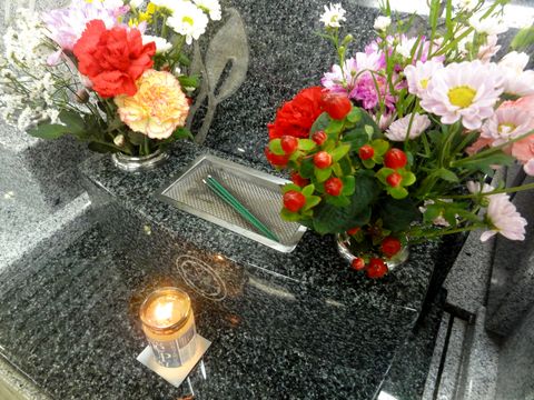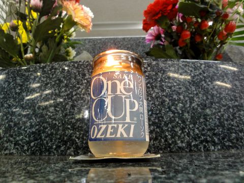 墓参りに8日が父の誕生日だったのでワンカップのろうそくを持参して点火。イオンの花は100円品がなし。 |